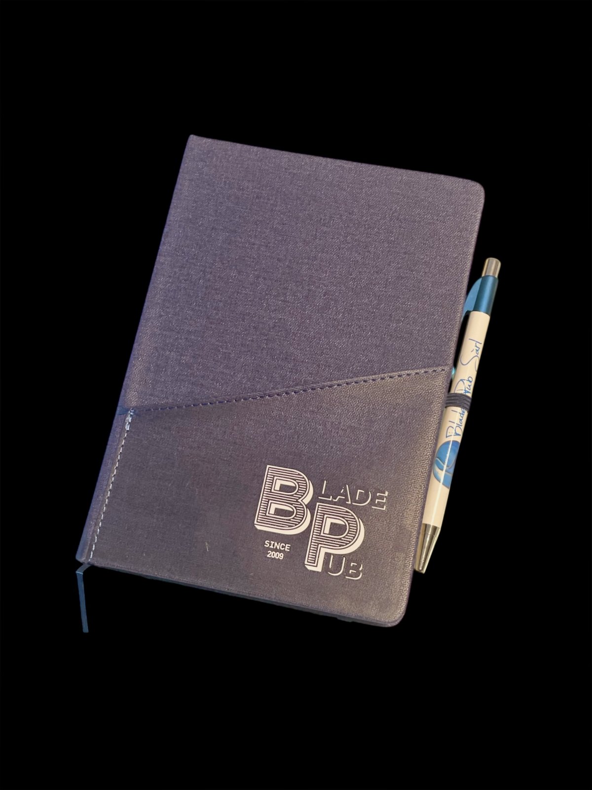 Carnet à couverture rigide en PU Recyclé, finition lin. Doté d’une poche frontale pratique, d’un porte-stylo, d’un marque-page assorti et d’un élastique de fermeture. Comprend 80 feuilles crème lignées. Avec emblème en PU Recyclé.